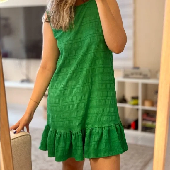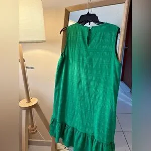 This elegant green dress features a sleeveless design with a stylish ruffle hem. Perfect for any occasion, it offers a comfortable and chic look.