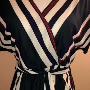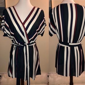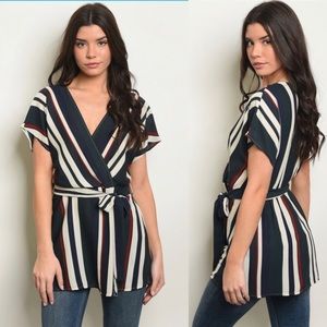 Green, Red, White and Navy Blue Stripes Top! Short sleeves with a cute tie for the back or front! VNeck.