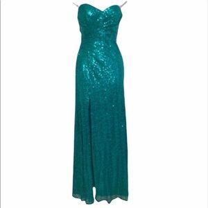 Stunning, strapless gown with a sweetheart neckline, sexy side slit, and side gathered details. Beautiful green sequins color is perfect for the holidays! Side zip with hook & eye close ( hook is still there but it needs a new loop for the eye)