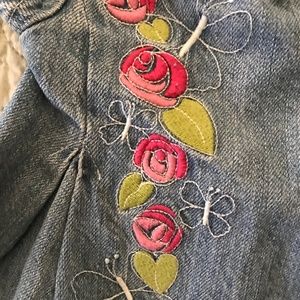 GREENDOG girls denim dress size 6-9 months, zipper back closure, embroidered with flowers and butterflies. (GD948)