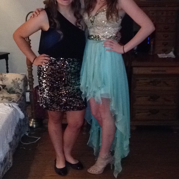 Size 4. Strapless. High-low hemline. Worn once, in new condition. Will come with hanger and a plastic dress bag