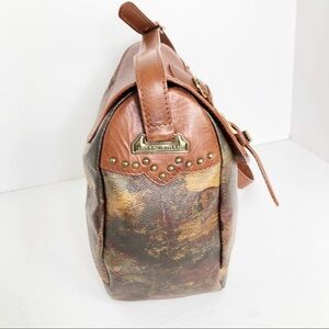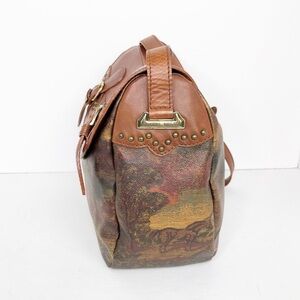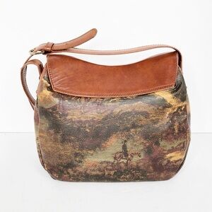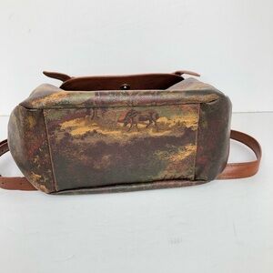Greenhills leather detail Crossbody shoulder bag, with brass hardware and snap closure with studs and graphics of horses on the range on the bag made in Italy.