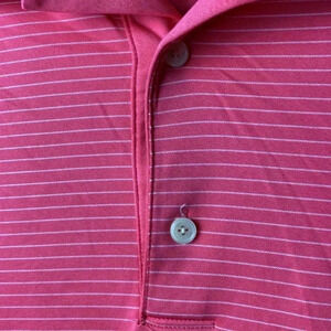 GREG NORMAN PLAY DRY MENS SIZE XXL POLO SHIRT CORAL WITH WHITE STRIPES GOOD CLEAN CONDITION LENGTH MEASURES APPROX 32” FROM SHOULDER TO HEM SLEEVES MEASURE APPROX 10” CHEST MEASURES APPROX 24” FROM SIDE TO SIDE