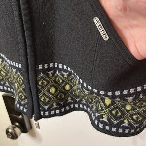 Stylish black jacket with intricate patterns. Perfect for adding a touch of elegance, The sweater has two front pockets. Fine craftsmanship, zip upfront ,made in Austria, long sleeve, crawl neck collar pit to pit 20”, length 24”! sleeve 24”,size 40 look at all pics and comment with any questions.