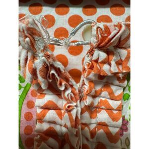 Adorable, ruffle trim sleeveless tunic with pockets at the waist. Side vents. Contrast lining. Ruffle placket at the chest with button and loop closure. Some elastics in the button closure are stretched, but still functional. Otherwise, this piece is in very good pre-owned condition. Could be a mini dress or tunic depending on your height.