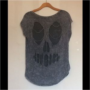 ✳️GREY DISTRESSED DYE TEE W/ SKULL CUTOUT ON BACK📌VISCOSE/POLY BLEND KNIT📌SIZE IS MEDIUM BUT IS SUPPOSED TO LOOK RELAXED/OVERSIZED📌NO LABEL, GENTLY WORN/GOOD CONDITION