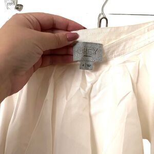 White satin-like mini skirt. Draped, asymmetrical style. Side zip closure. Great preloved condition - only flaw is no material tag. Size 4