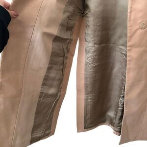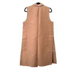 Beige sateen twill (similar to a wool texture) sleeveless trench. Vest style. High side slits. Leather details on front. Flap front pockets. Lined. New without tags - no material tag and small pen mark on back (would come out with a wash). Size 4