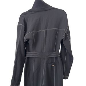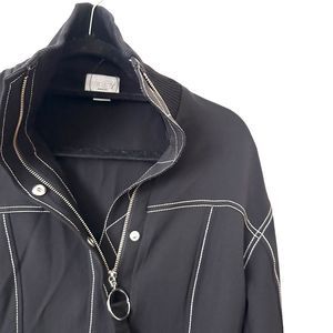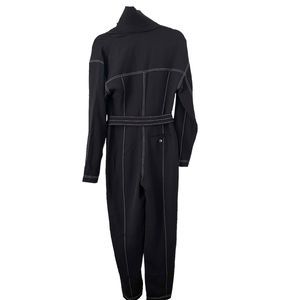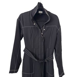 Black jumpsuit - white seams. Zippered, snap closure. Ribbed collar. Snap closure buttoned belt. New without tags, no material tag. Size 4