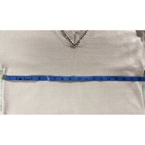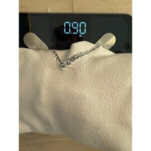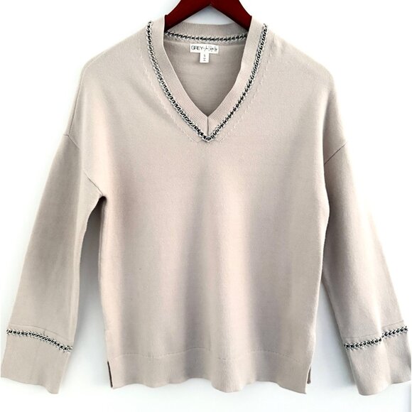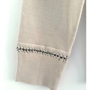 Beautiful chain-trim sweater by GREY Jason Wu in a soft light taupe. V-neckline and cuffs feature silver chain accent for subtle edge. Lightweight viscose blend with side vents and dropped shoulders. Excellent preowned condition.