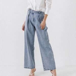 These jeans feature a unique wrapped detail at the button fly and a flattering high waist. The pleat tuck crossover design adds a stylish touch to these straight leg denim jeans. They are new with tags and ready to elevate your wardrobe!