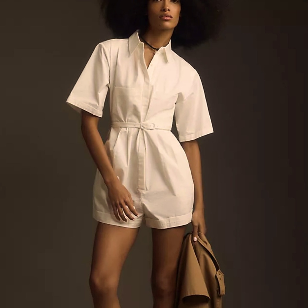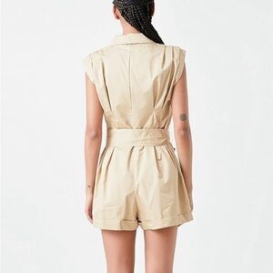 Stock photo (first/last) is just a super great style example. Collared, button up front closure, stitched fold legs, pockets, belted as seen in pictures 2-5, pleated effect style to front/back and shoulders. Item has been fitted and is subject to minor soils, no soil evident.