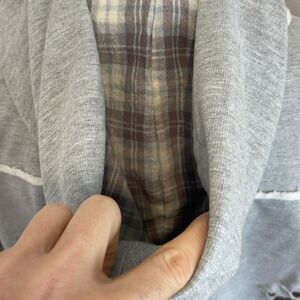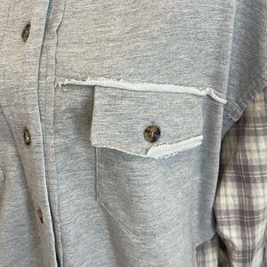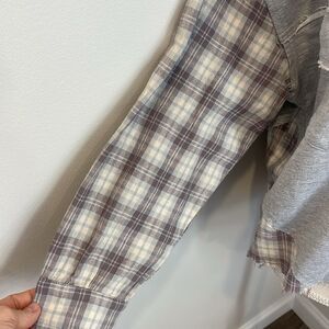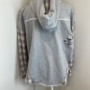 GREY SHACKET WITH COLLAR, PLAID SLEEVES & REMOVABLE HOOD