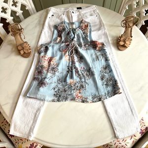 This sleeveless silk top by Stitch Fix brand Greylin features a tassel tie neckline, ruffled shoulders, and a floral print on a light blue background. Fully lined. Purchased from Stitch Fix.