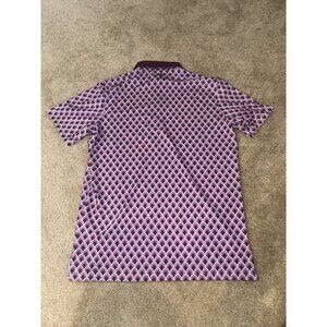 This GREYSON Men's Medium Polo Shirt is the perfect addition to your wardrobe. The shirt features a beautiful geometric pattern in shades of purple, with a collared neckline and short sleeves. Made from a blend of polyester, spandex, and polyester blend fabric, it is lightweight, stretchy, and breathable, making it perfect for any activity, including golf.