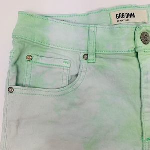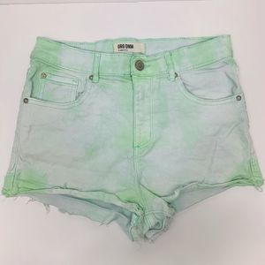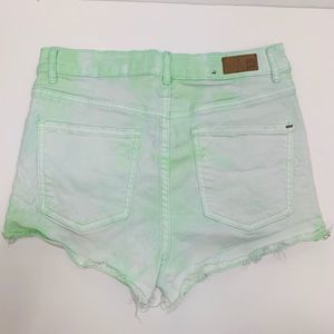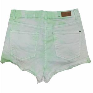 GRG Denim Montreal High Waisted Cut Off Denim Shorts. Green and white pattern. Possibly tie dye pattern.