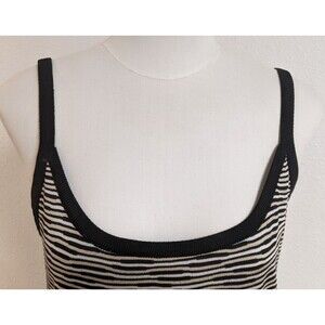 Elevate your wardrobe with the Griffith Gray For St. John women's knit strappy classic tank top, a versatile piece that seamlessly transitions from casual outings to chic cocktail events. The medium-sized tank features a sophisticated black, white, and tan striped pattern, complemented by a flattering scoop neckline and supportive spaghetti straps.