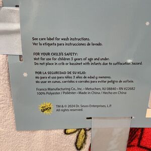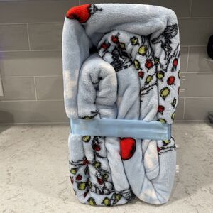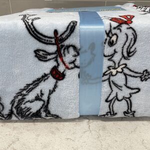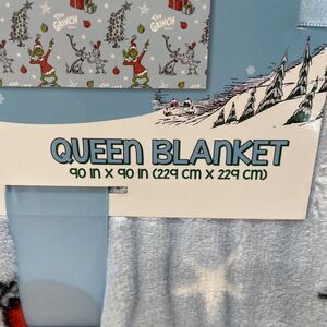 This cozy plush blanket features the Grinch and Max. Light blue ground with green, red, yellow multicolored. Measuring 90x90 inches, it's the perfect size for a full or queen bed and will keep you warm during chilly nights. The blanket is made of soft plush polyester, is machine washable and easy to care for.