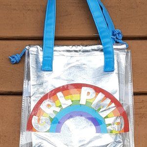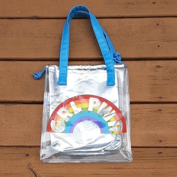 This 2-in-1 bag is so super cute! Clear bag on the outside and removable drawstring pouch on the inside. "GRL PWR" (short for Girl Power) features a rainbow with a shiny silver bag inside.