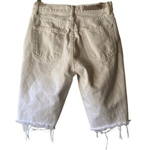 Revolve GRLFRND Beverly Slim Fit Bermuda Jean Shorts in Love Interruption color, which is white, with distressed details and a frayed hem. These shorts feature a high rise, a button fly closure, belt loops, and five-pocket styling. They are made of 100% cotton. The shorts are designed to fit true to size.