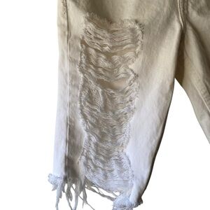 Distressed elements include rips and frayed edges, giving them a casual, worn look.