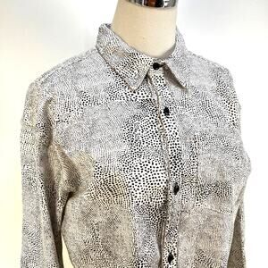 New with tags, unused, no flaws or odors. Raw hem, breast pocket, button front. Can be worn as a jacket or crop top. Unlined. White and black printed.