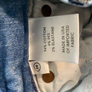 Features: distressed on the thighs and knee, zip fly, button closure, 5 pockets, raw fringe hem, cotton, PES, elastane blend, slightly stretchy fabric, high rise or high waisted