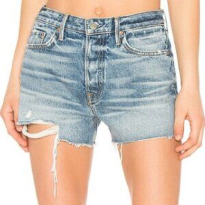 GRLFRND Helena High-Rise Straight Leg Cut Off Short blue rain drop wash 27. Was is Rain drop - blue distressed denim jean shorts size 27. Excellent condition. Retails for $148 on revolve. Waist flat is 14 in. Rise is 10.5 in. Inseam is 3 in. 100% cotton. Made in the USA.