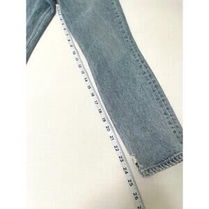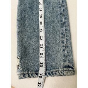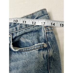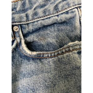 Details: Size 25, slightly distressed on thigh and at hems, acid wash 90's like style, high rise button fly, light discoloration spot