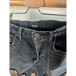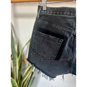 GRLFRND Karolina Denim Shorts in Blackhearts. High rise shorts, black distressed denim. Fraying at hems and waist. Button fly closure. Good used condition.