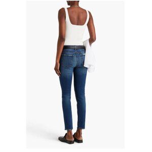 Skinny jeans denim distressed trims belt loops high-rise cut multipockets partially concealed button fastenings along front frayed cuffs mid-weight, non-stretchy fabric machine wash or dry clean. 99% Cotton 1% Lycra®.