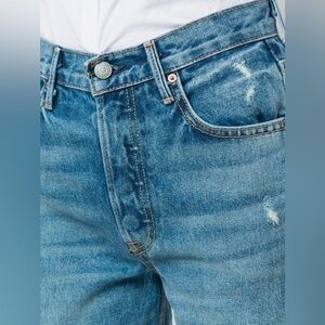 Dusty blue cotton cropped straight leg jeans from GRLFRND featuring a waistband with belt loops, a mid rise, a button and zip fly, a five pocket design, a straight leg and a cropped length.