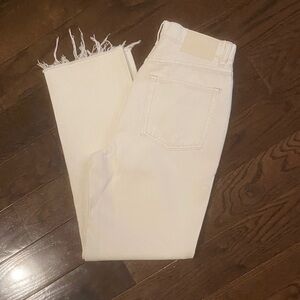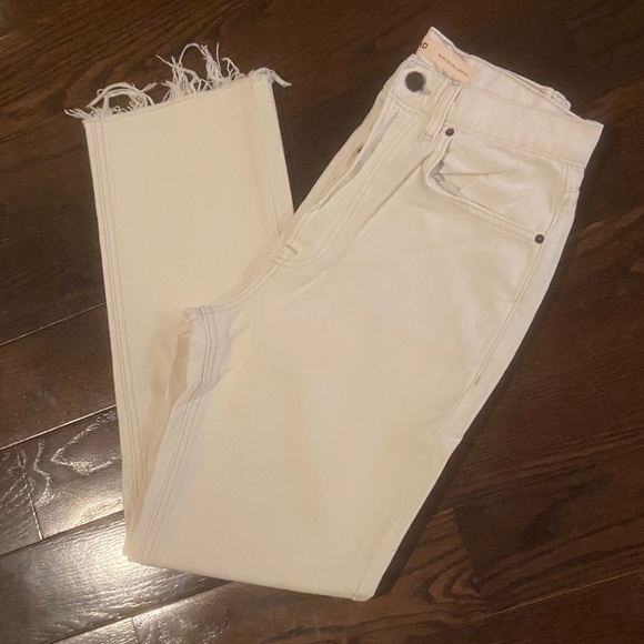 Stylish straight leg jeans. Frayed hem. Classic five-pocket design. Button closure. It has button fly instead zip. %100 Cotton