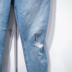 High rise destroyed style jean with raw hem.