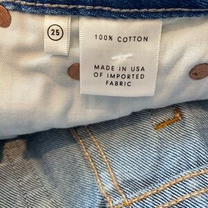 Denim miniskirt in lava bed blue. Fading whiskering and distressing throughout. High-rise. Five-pocket styling. Tan leather logo patch at back waistband. Asymmetric hem. Button-fly. Antiqued silver-tone and copper-tone hardware. Contrast stitching in tan and white.