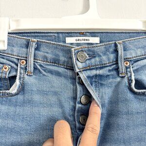 GRLFRND Tatum Jeans, women’s size 24! Slight bootcut with a raw hem, hidden button closure, medium wash.