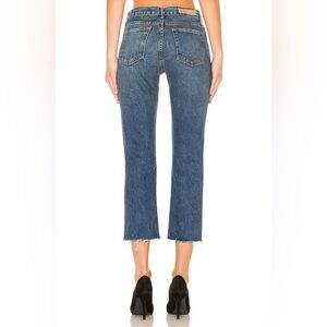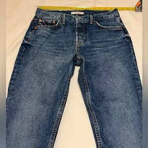 GRLFRND medium wash cropped jeans with raw hem. Measures 14 inches across waist, 9 inch rise, and 25 inch inseam. 100% cotton with hidden button fly. Some dye transfer on the back logo patch and some wear and dye fading along rear seams, as shown in photos. No holes or stains.