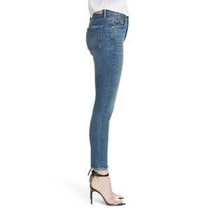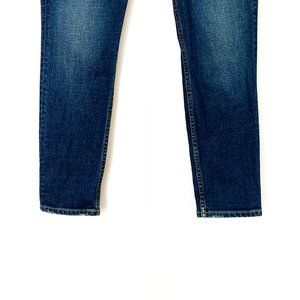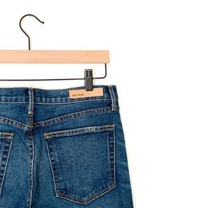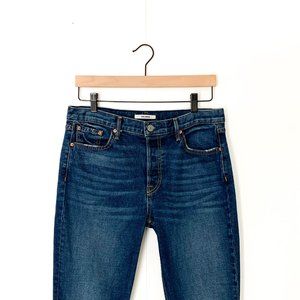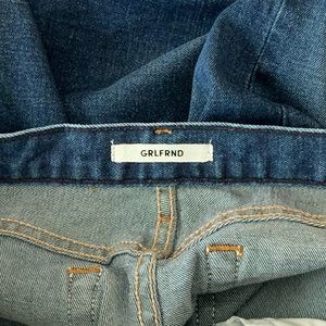 GRLFRND Yasmin high rise button fly jeans. Skinny legging style. Dark wash with whiskering and light distressing detail. 5 pocket. Stretch. Style GF4030883391. Color Joan Jett. Pre-owned, excellent condition. Size 29. 16" waist, 10" rise, 28" inseam, 37.5" length, 6" leg opening. 98% cotton, 2% elastane. Machine wash.