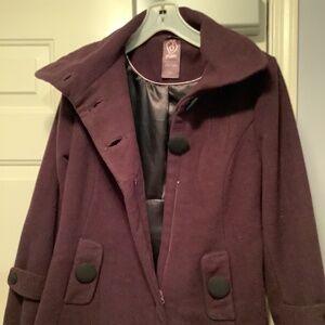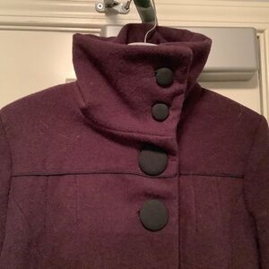 NWT. Never worn. Lined purple wool coat with big collar that can be raised and button around the neck to keep out the cold. black button closure. Coat zippers about 3/4 up and then large black buttons close the top. Side slash pockets. (buttons on pockets are just decorative). Spare buttons are attached)