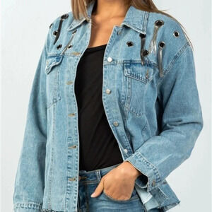 Denim jacket features: button front closure, long sleeve, two button chest pockets, two front pockets, grommet detail, metal fringe, raw hem, loose fit.