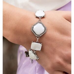 A sophisticated mashup of earthy white stones, milky white beads, and sparkling rhinestones in various shapes and sizes create a stunning display around the wrist. Features an adjustable clasp closure.