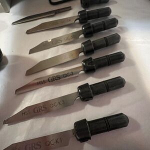 Eight gravers with handle and a Hex tool to remove graver from holder. There is also a used bench pen with GRS bench attachment. The plate that attaches to the bench or work table is available at GRS tools, Gesswein, and Stiller tools...all over the internet.