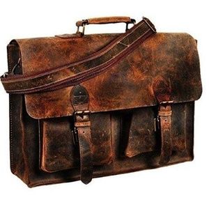 Richly-textured leather messenger bag and briefcase with weathered brass hardware. Buffalo hide leather. Long shoulder strap and top handle. Zippered pockets and padded laptop compartment. Handmade weathered look. Lined. Fits 15” laptop. Processed the use of chemicals or dyes. All natural product. Durable and flexible materials.