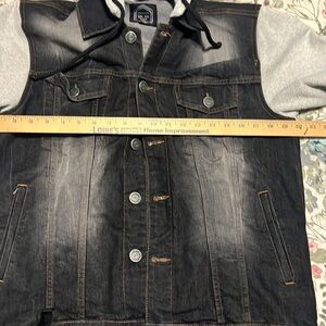 I love this jacket. Jean jacket with hoodie hood and sleeves. Buttons closed, zipper needs to be replaced. Size medium. Detachable hood. Some signs of pilling on sleeves from wear, much loved ;)