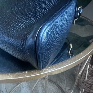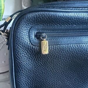 Elegant leather shoulder bag with sleek design. Features gold hardware accents.
