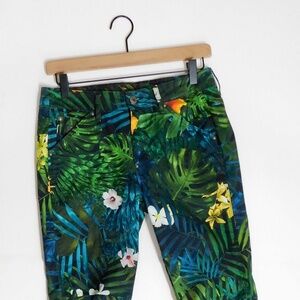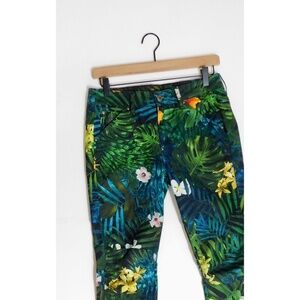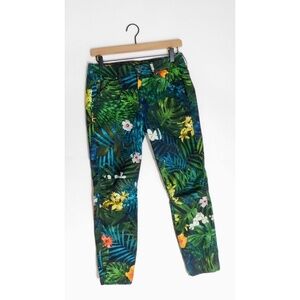 Defined waistband with belt loops ~ Button & zipper closures on the front ~ Classic 5 pocket styling ~ Tapered legs with panels at the knees ~ Slightly cropped length ~ Crisp unlined fabric ~ Tropical floral & palm leaf print in shades of green, blue, yellow, pink, aqua & red … print is called “Aloha”