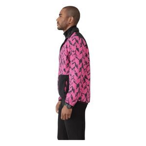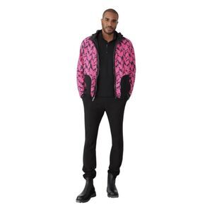 GSTQ Men's Reversible Jacket in Pink and Black Herringbone Print. A versatile layer for rain or shine. Wear it one way for a statement look, or flip it to the solid black side to stay dry. God Save The Queen
