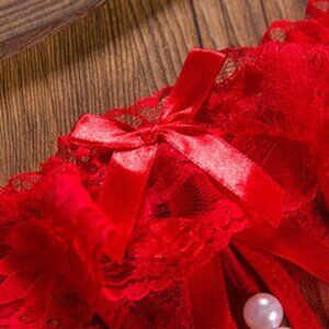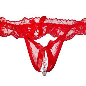 Red g-string thong panty is sheer transparent with front open crotch style.