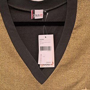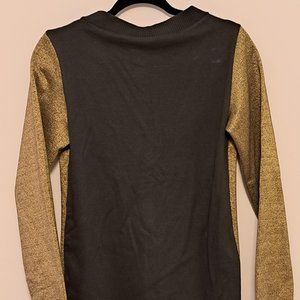 GSUS Ladies Knit Sweatshirt NWT Size Medium. Ribbed contrasting collar. Beautiful gold knit metalic top with green knit back. Green contrasting ribbed hem. Contrasting green ribbing at cuffs. 60% Cotton/40% Lurex. Measurements Shoulder to shoulder laid flat - 17" , Pit to Pit - 17", Length of Top from shoulder to hem - 27" , Sleeve Length - 27".