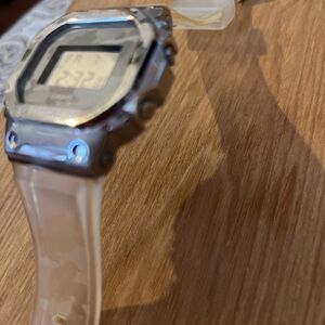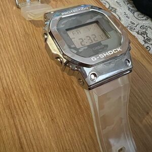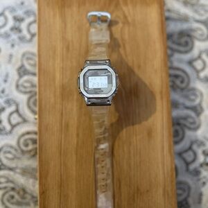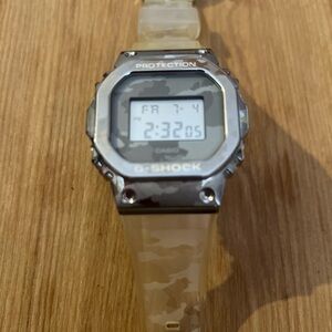 Rugged G-Shock smartwatch with a silver camouflage design. Features digital display and durable build.